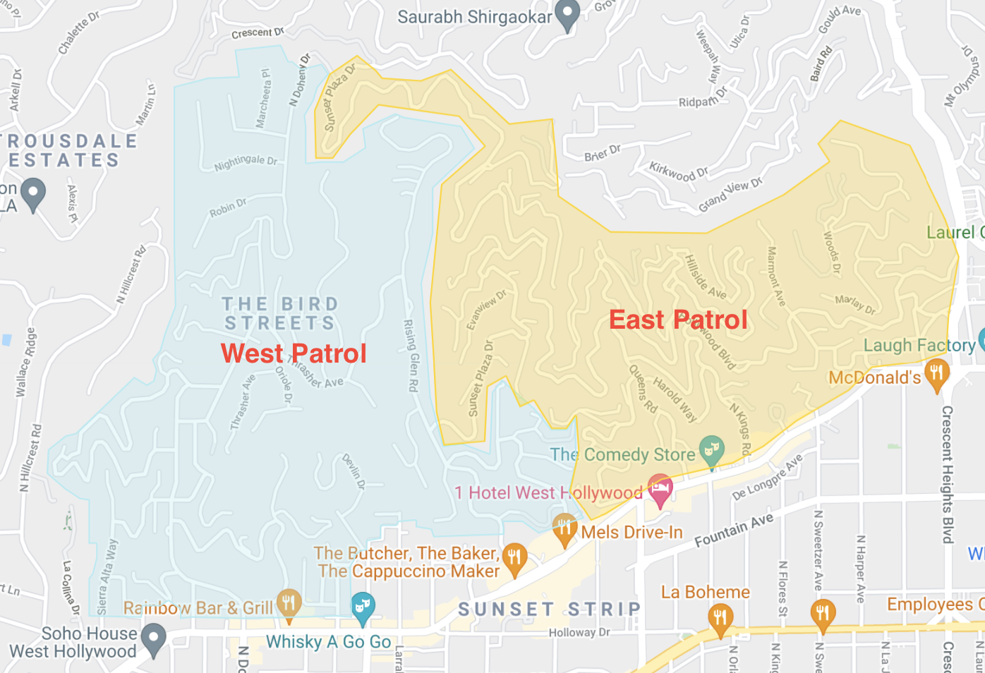 The security patrol program is currently available in all areas of the map bounded on the west side by Sierra Alta and on the east by Londonderry Place, lower Sunset Plaza Drive and Rising Glen Road.